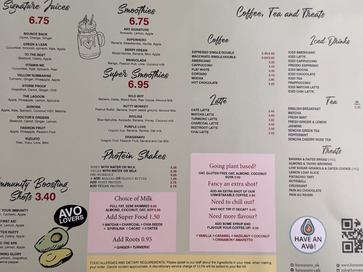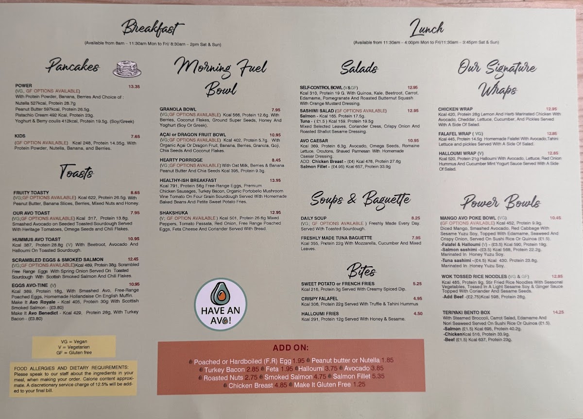 The menu at Have An Avo in London offers a vibrant array of healthy and indulgent options, perfectly blending nutritious meals with delicious flavors. For breakfast, try the Power Pancakes or the Kids Pancakes, or opt for a hearty start with their Morning Fuel Bowl, which includes options like the Granola Bowl or a refreshing Açai or Dragon Fruit Bowl. The savory side of the menu features favorites such as the Shakshuka and the Hearty Porridge, catering to both light and filling breakfast cravings. If you’re in the mood for a power-packed meal, their Mango Avo Poke Bowl and Wok Tossed Rice Noodles are ideal choices. The Teriyaki Bento Box offers a balanced and flavorful dish for those looking for something a bit more substantial.
